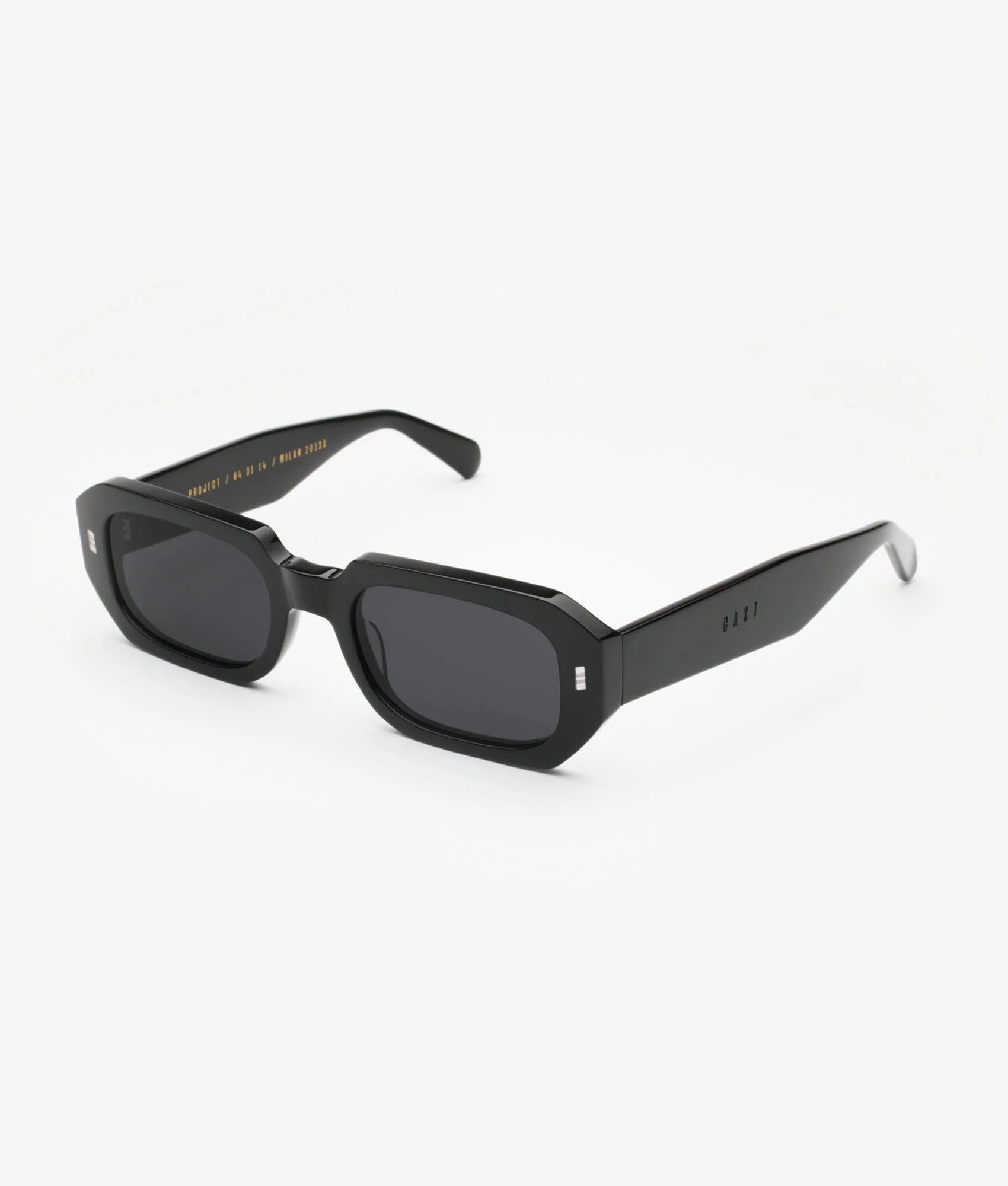 Occhiale da sole fatto a mano con montatura in acetato colore nero e lenti in nylon nere semi-piatte con anti-riflesso interno - Protezione 100% dai raggi UVA / UVB. Cerniere a cinque snodi. Astuccio premium semi-rigido effetto similpelle e panno in microfibra inclusi.